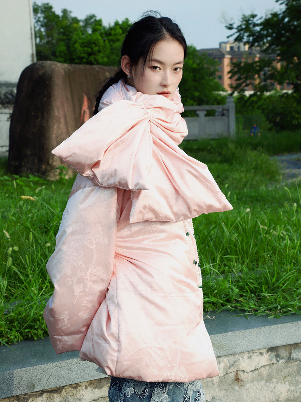 2、We have independently developed a new type of fabric. A down membrane is attached to the bottom of the jacquard satin, which is not easy to run down. The fabric can not only retain luster and stiffness, but also have a solid and warm feeling given by a high down content of 90%.